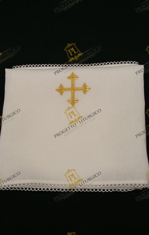 Per questo motivo, l'amitto è realizzato in lino bianco, ad indicare la purezza. Ad impreziosirlo, una croce ricamata con filato dorato. Lungo tutto il bordo corre un delicato e discreto tombolo.