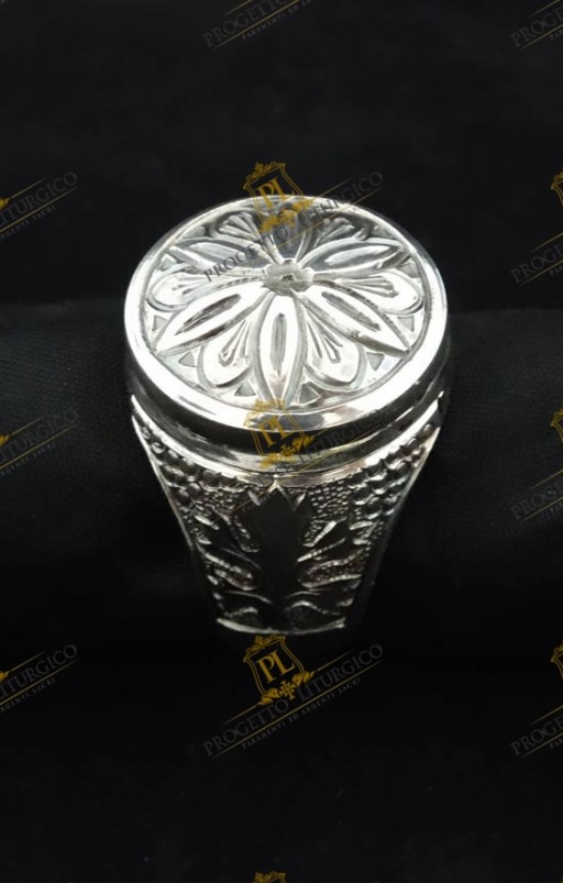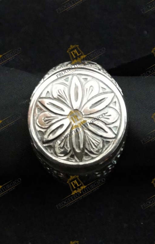 L'anello vescovile in argento 925 che qui presentiamo è realizzato interamente a mano, a partire dal disegno, per finire alla brunitura dell'argento.