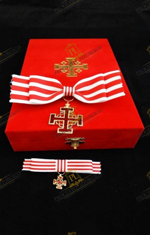 Le insegne argento per cavaliere Santo Sepolcro sono costituite da collare in seta con effetto moiré da cui pende la croce di Gerusalemme in argento dorato e smaltato di rosso; una croce di gala piccola dell'ordine in argento dorato con smalto rosso; una rosetta in seta da occhiello per abiti civili.