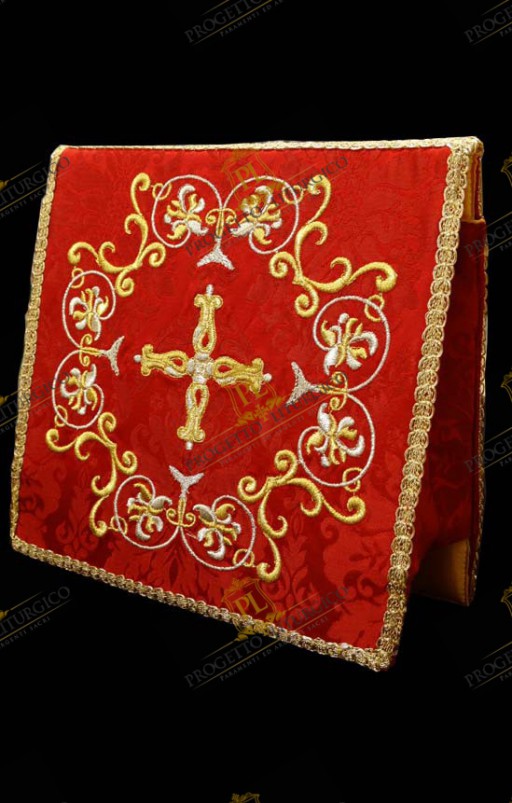 The red corporal burse is made of precious damask fabric. Only on one side of the corporal burse is there a rich embroidery with floral motifs and made in two different shades of gold.