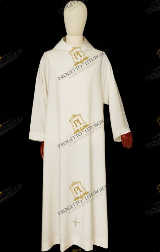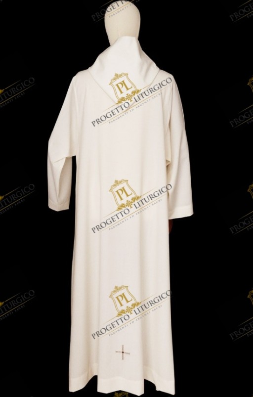 Il camice francescano con cappuccio ha una linea molto semplice, leggermente svasata. Sul fondo, sia sul davanti che sul dietro, è realizzata una croce a punto gigliuccio sfilato a mano.