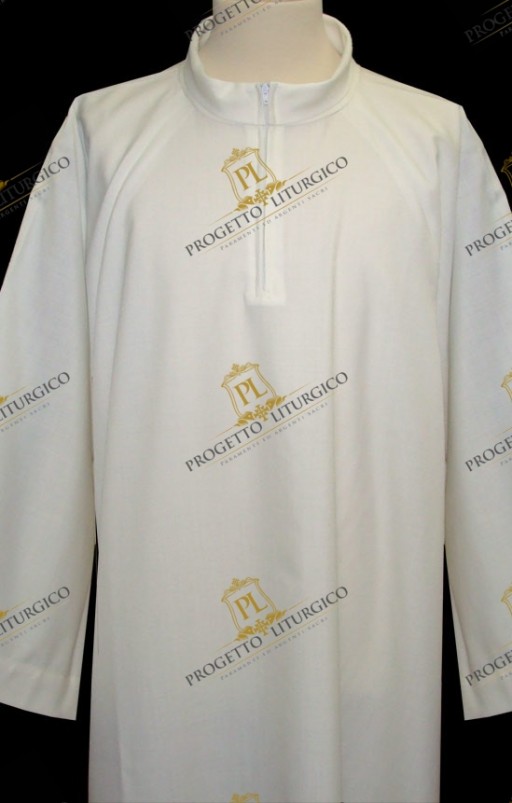 Il camice sacerdotale con manica raglan ha il collo risvoltato e la pratica chiusura a zip sul davanti