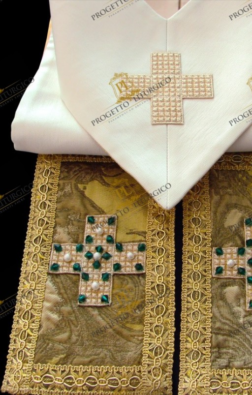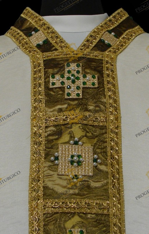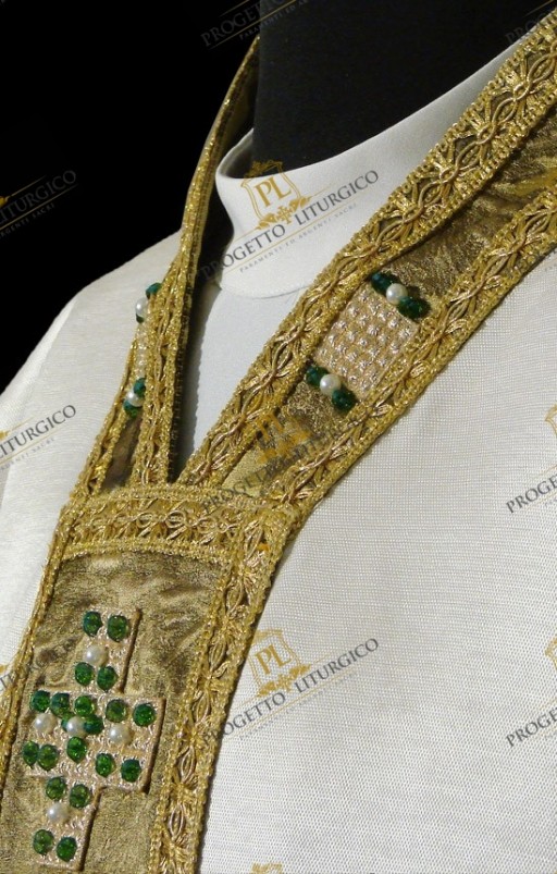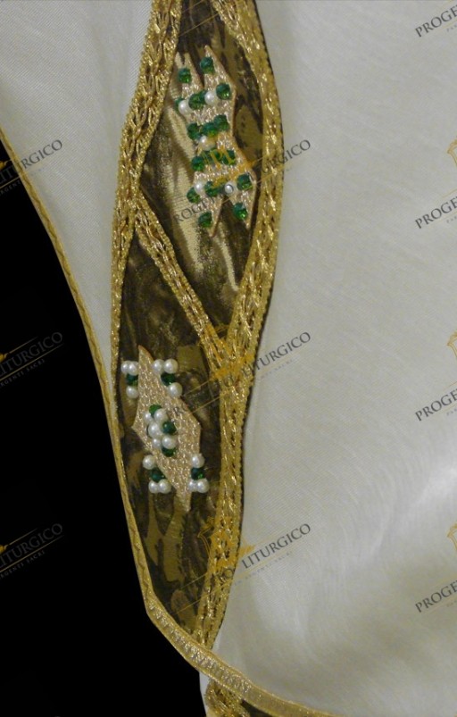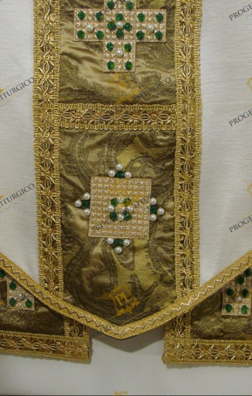 Those who make sacred vestments often forget that in addition to the main fabric, we must not overlook the quality of the contrasting fabric. In this white gothic chasuble, both the neck, the stoles and the bottom of the stole are made with a precious brocade in green/gold nuances.