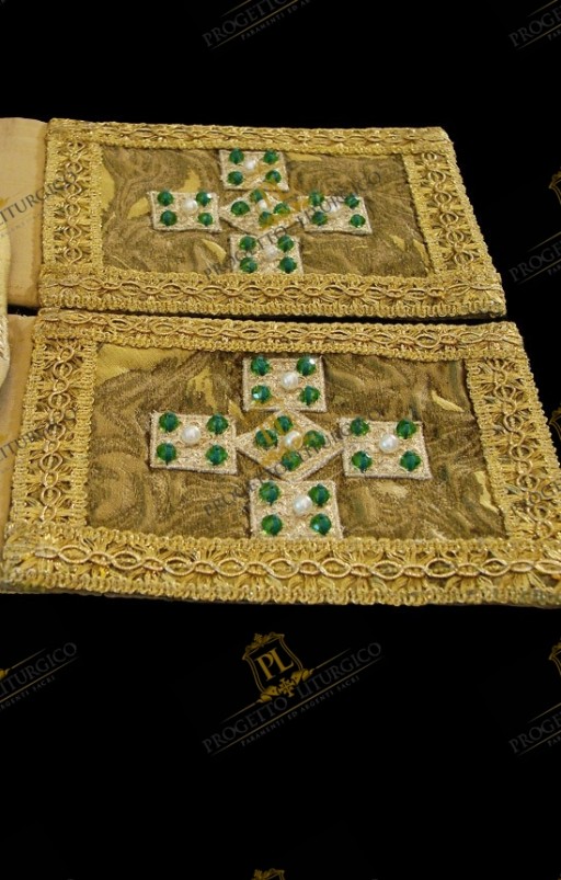 The geometric decoration of the central stolons and the upright collar is made with a precious, very particular brocade fabric. Here, alternately, embroidered elements are placed and embellished with green crystals and pearls, to form stylized crosses and lilies.