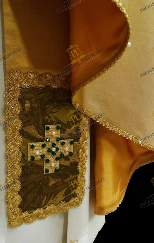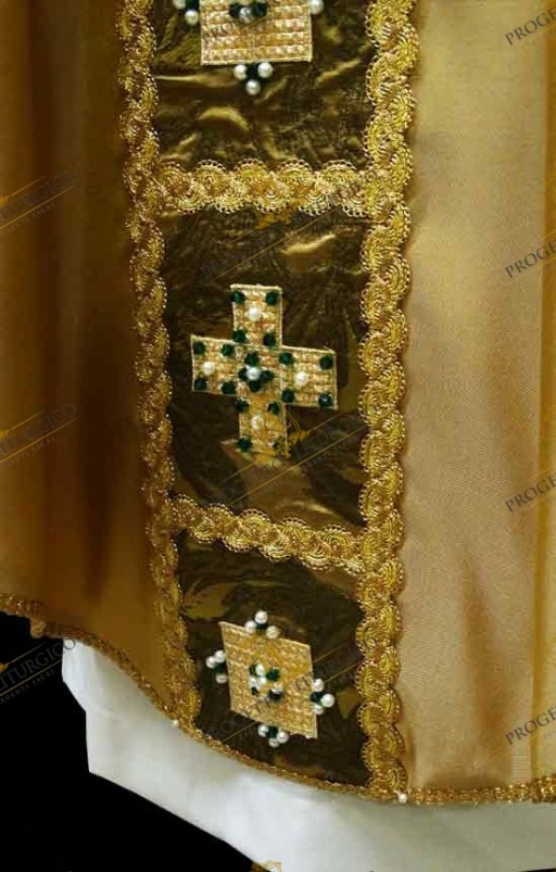The geometric decoration of the central stolons and the upright neck of the golden chasuble is made with a precious, very particular brocade fabric. Here, alternately, there are embroidered elements on which green crystals and pearls are hand-sewn.