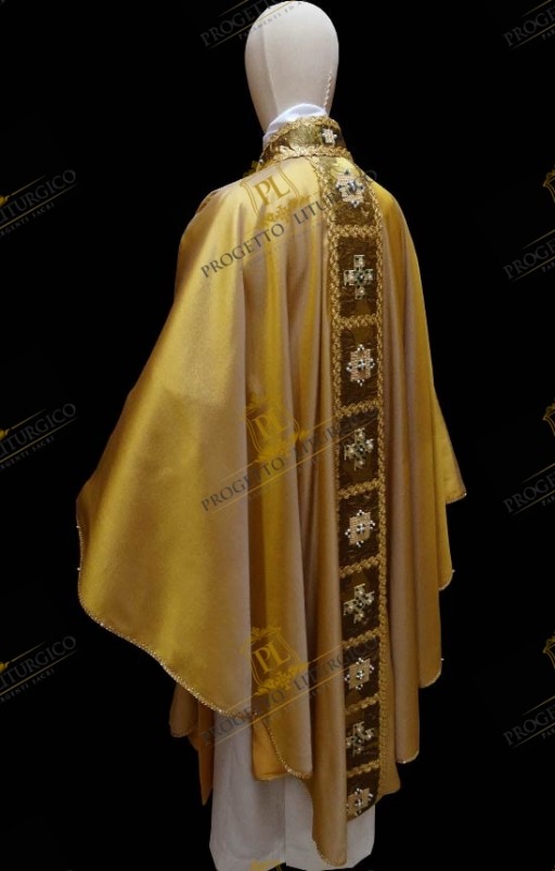 This golden chasuble is suitable for solemn liturgical celebrations. It is made of a precious gold-colored silk mikado fabric and the shape recalls the medieval model.