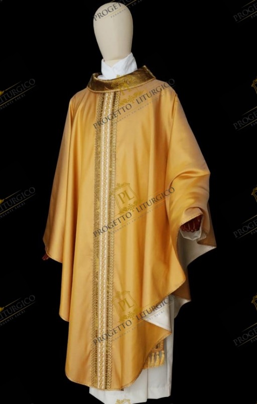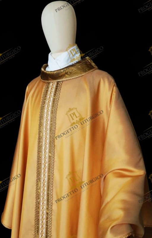 The golden chasuble, in fact, is made of a very soft mikado golden silk fabric and lined with an ivory satin. The round neck of the golden chasuble is instead made with a very particular fabric, a silk brocade with an iridescent green color, with golden shades, really very beautiful.