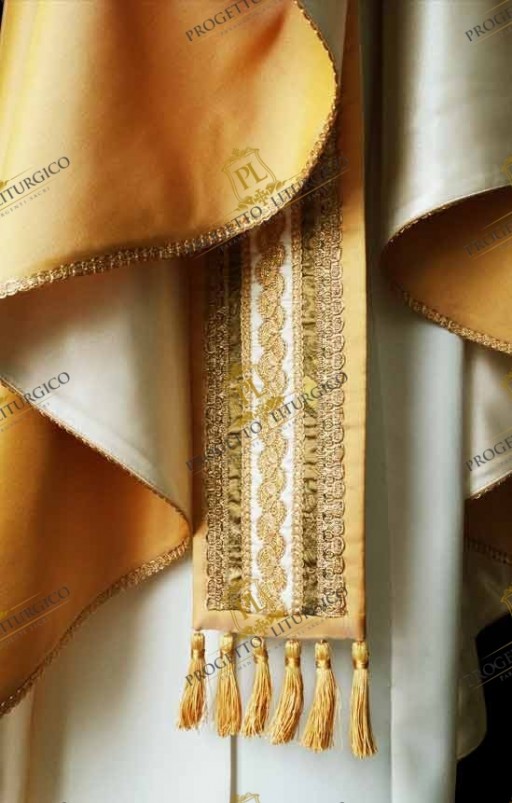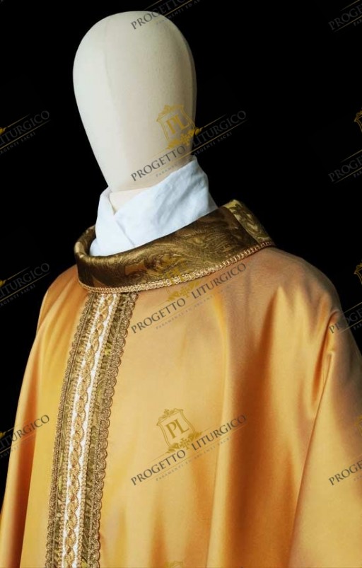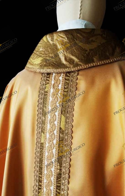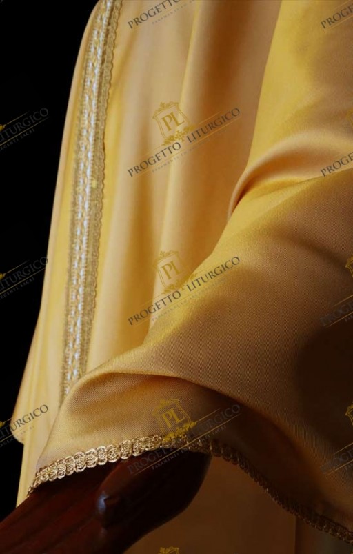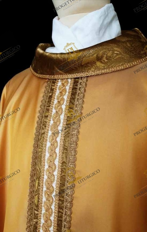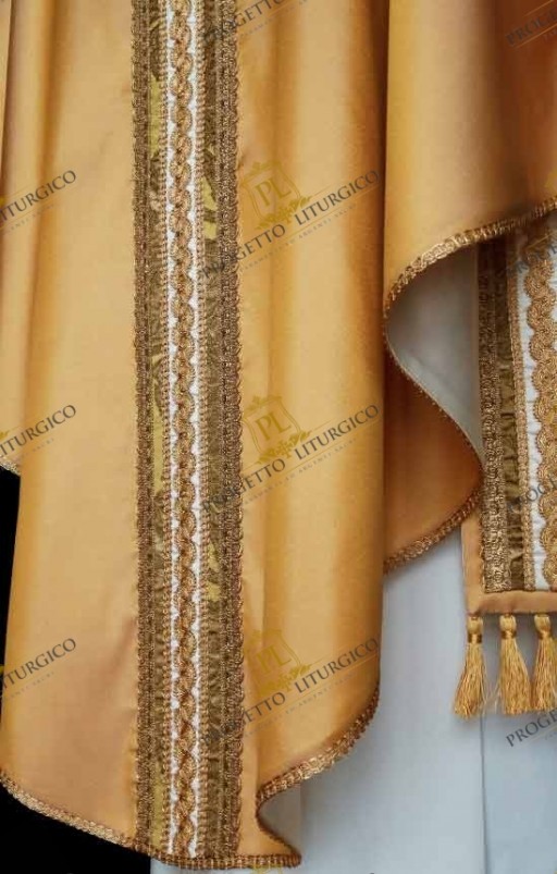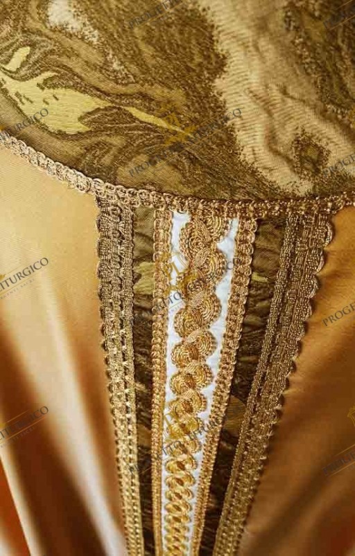 The same brocade composes the refined decoration of the golden chasuble, characterized by a play of contrasts between fabrics and golden agremans. The same decoration is reproduced on the edges of the stole that completes the golden chasuble.