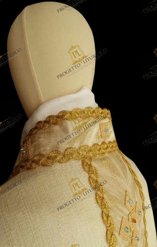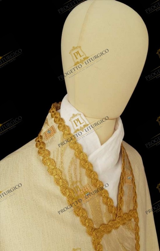 The upright collar, typical of the medieval style, is instead made of golden brocade fabric. The same fabric is used for the stoles that decorate the front and back of the chasuble.