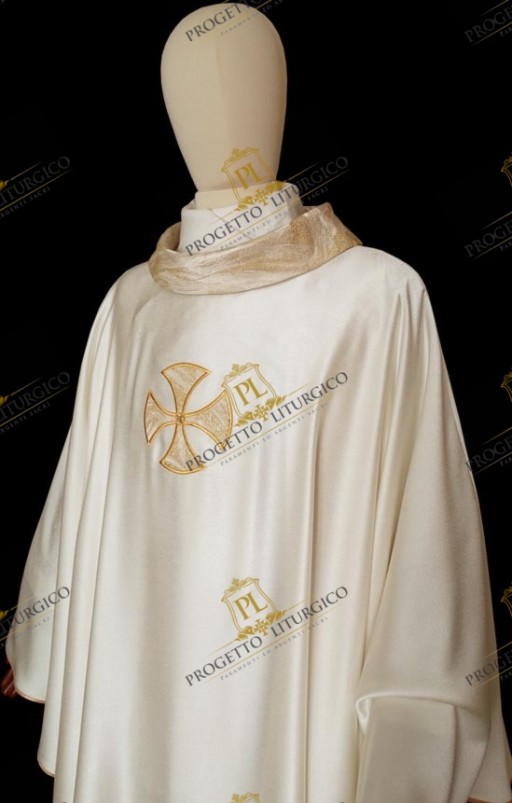 The priestly stole coordinated with the white chasuble has the same cross in brocade fabric on the chest of the vestment at the ends of the two flaps. The cross around the stole neck, on the other hand, is embroidered with golden thread.