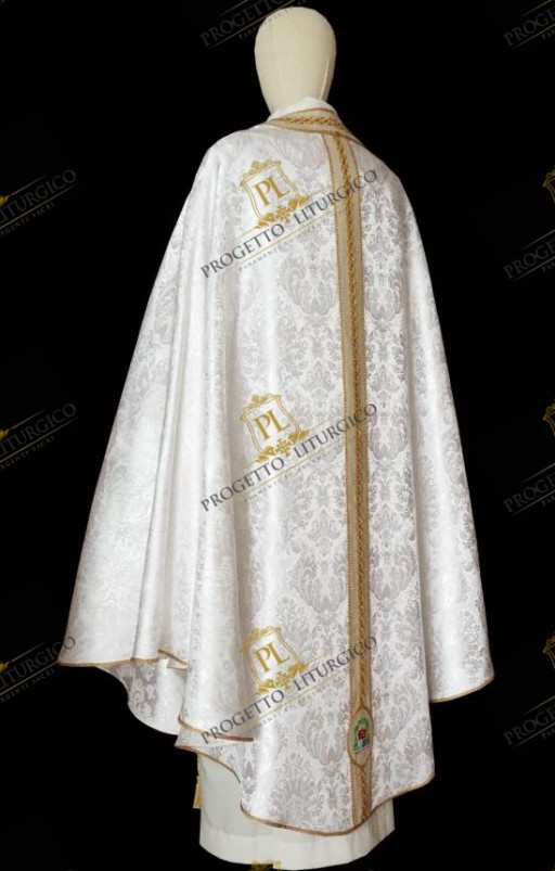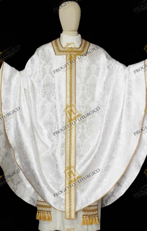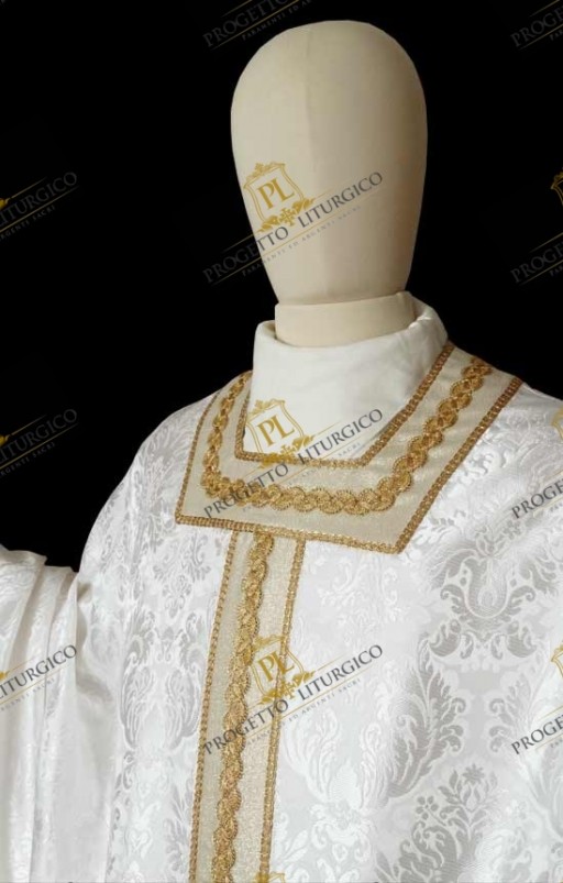 The early Christian white chasuble made of brocade fabric is a vestment of remarkable elegance. The fabric with which it was made, a very precious brocade, is highlighted by the play of agremans that constitutes the decoration.