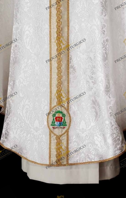 The decoration of the early Christian white chasuble is made of golden papal wool, embellished with a delicate play of agremans. It forms the square neckline and the stolons on the front and back. While on the front the stolon is left free, on the back it has a further decorative element consisting of the episcopal symbol.