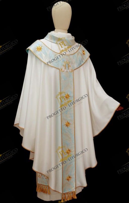 This very precious Marian chasuble with pallium is made of light and flowing ivory cady fabric, with a round collar in light blue brocade.