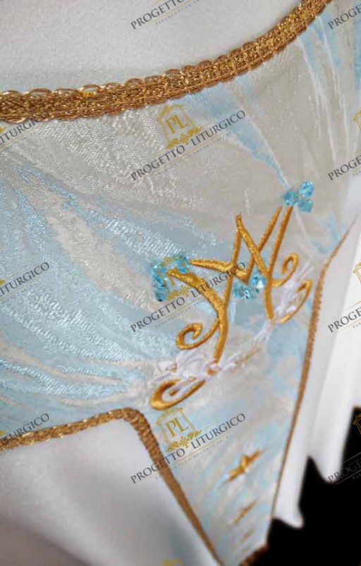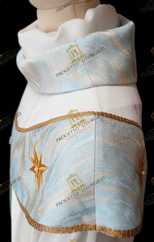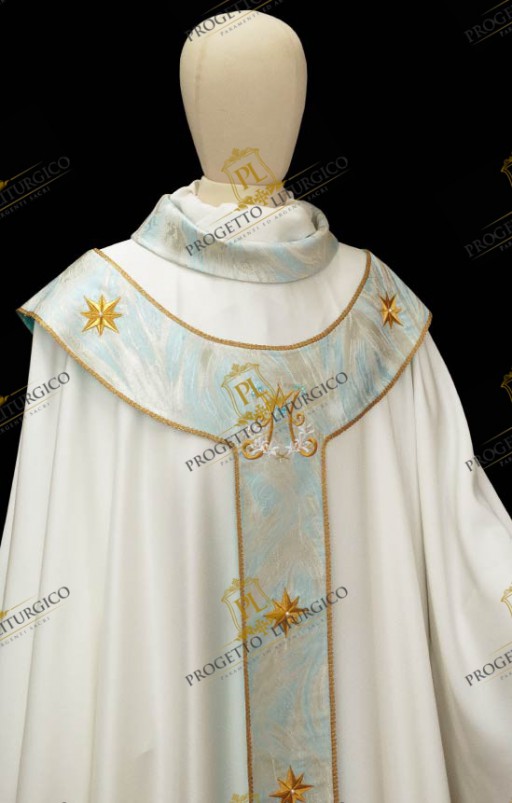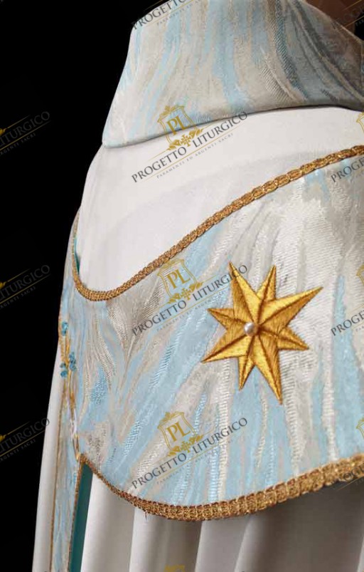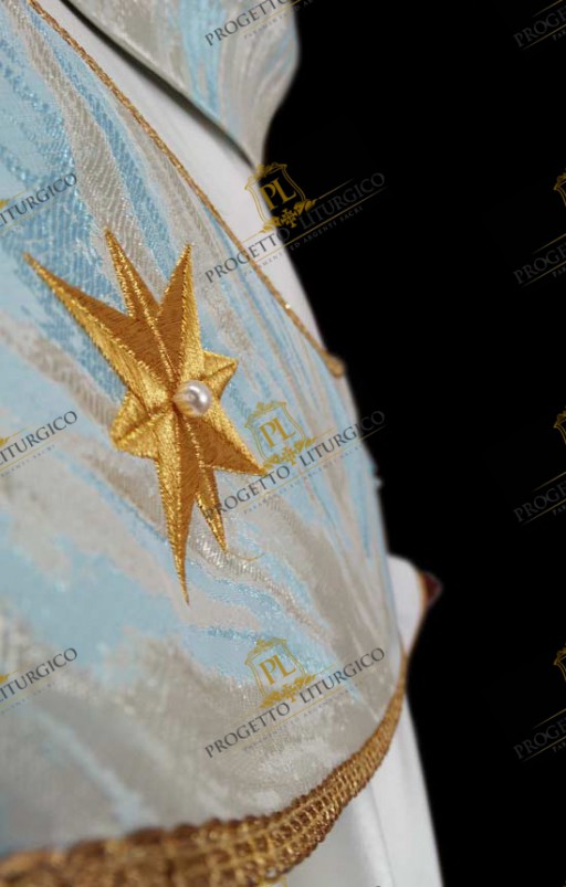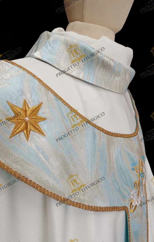 The pallium of the Marian chasuble is made of light blue toned flame brocade, the same as the neck. In the center of the pallium, both on the front and on the back, the Marian monogram is embroidered in golden thread, embellished with delicate white lilies. Furthermore, twelve eight-pointed stars are embroidered all over the pallium.