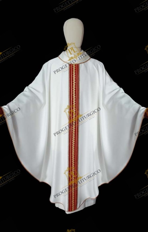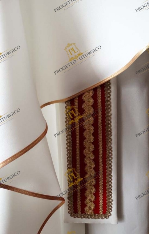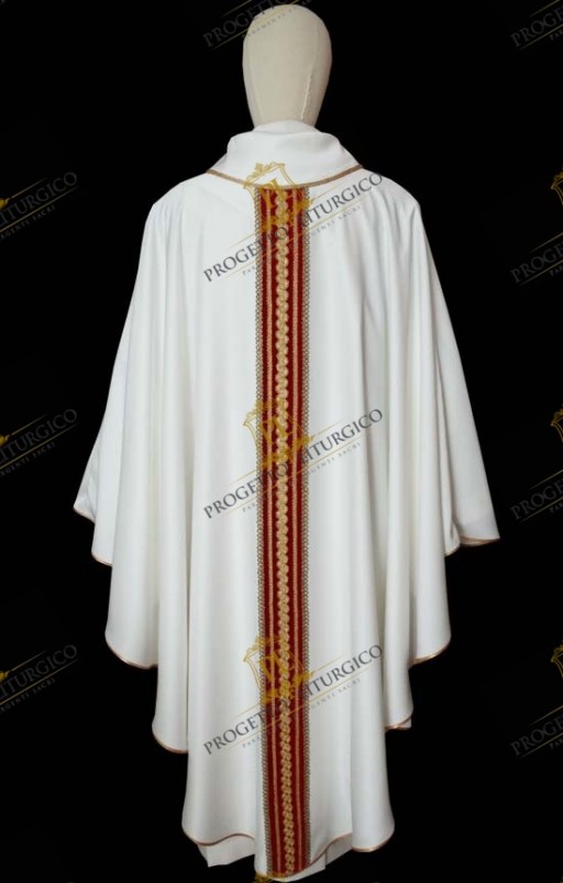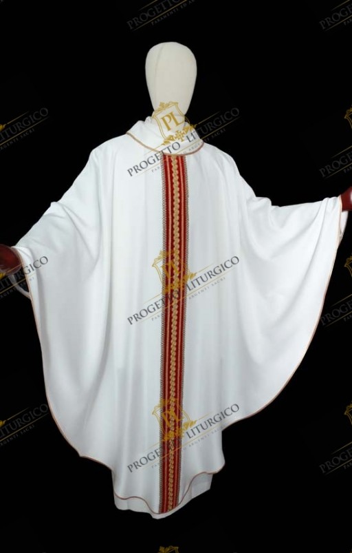 The decoration of the white chasuble consists of two stolons, one on the front and one on the back, made with a game of alternating golden agremans and very precious red velvet.