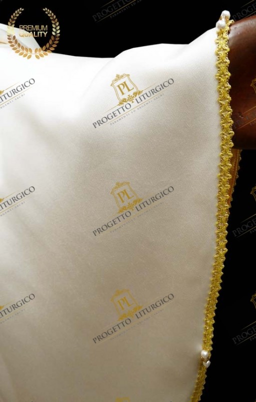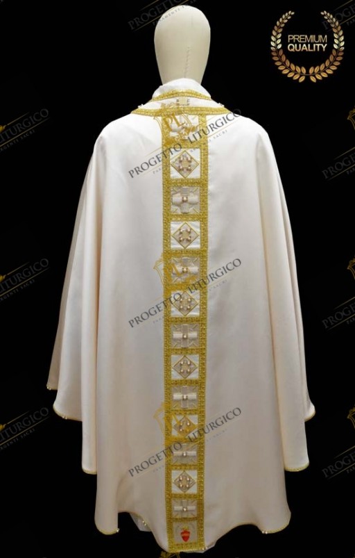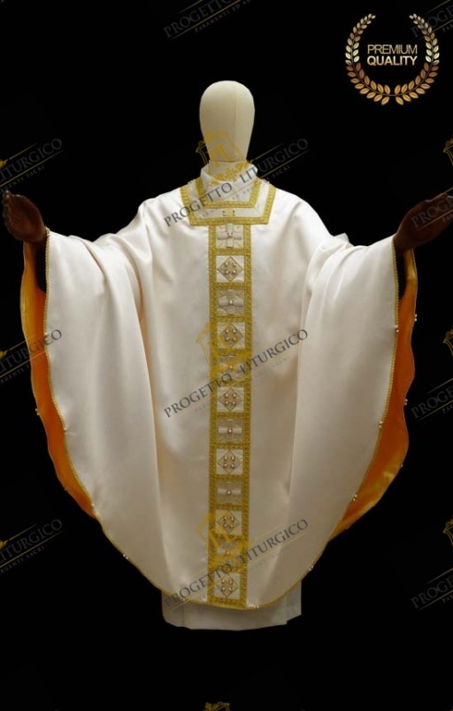 The early Christian white chasuble is made of soft mikado satin fabric lined with light gold satin.