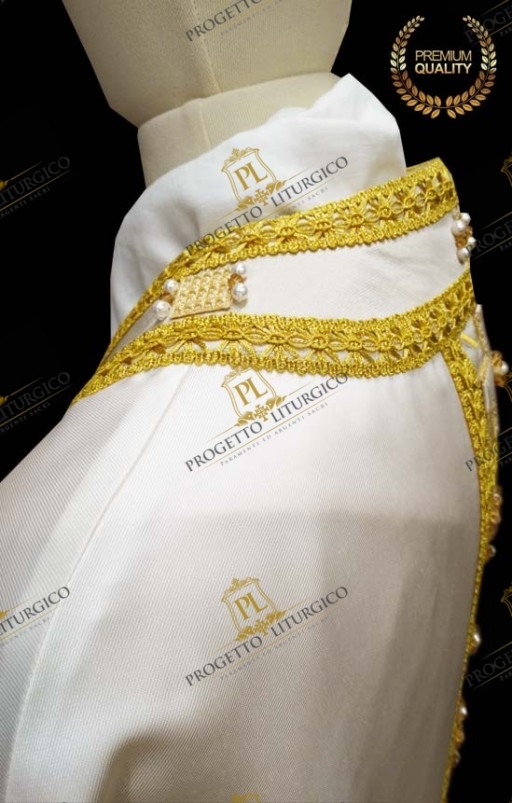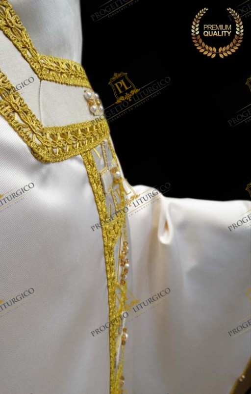 Along the entire edge of this white early Christian chasuble runs a delicate golden perforated agreman, which makes the garment even more precious and on which crystals and pearls have been sewn by hand.