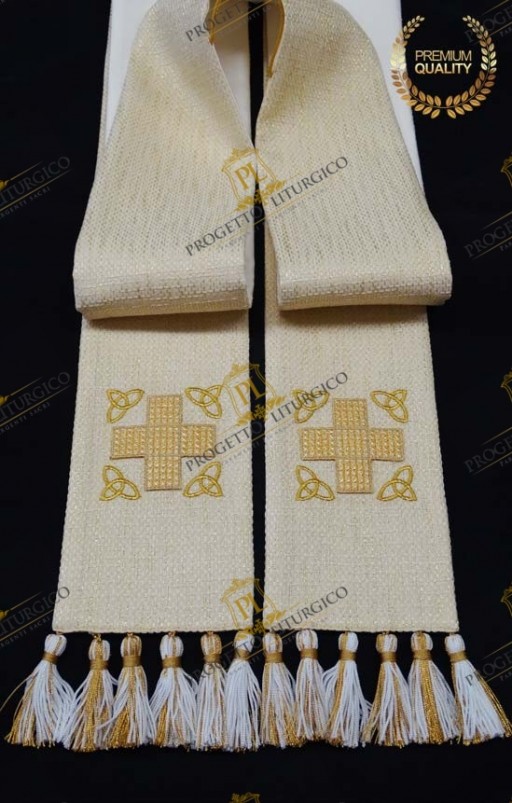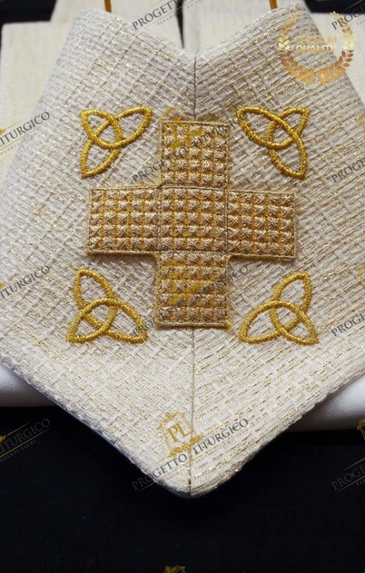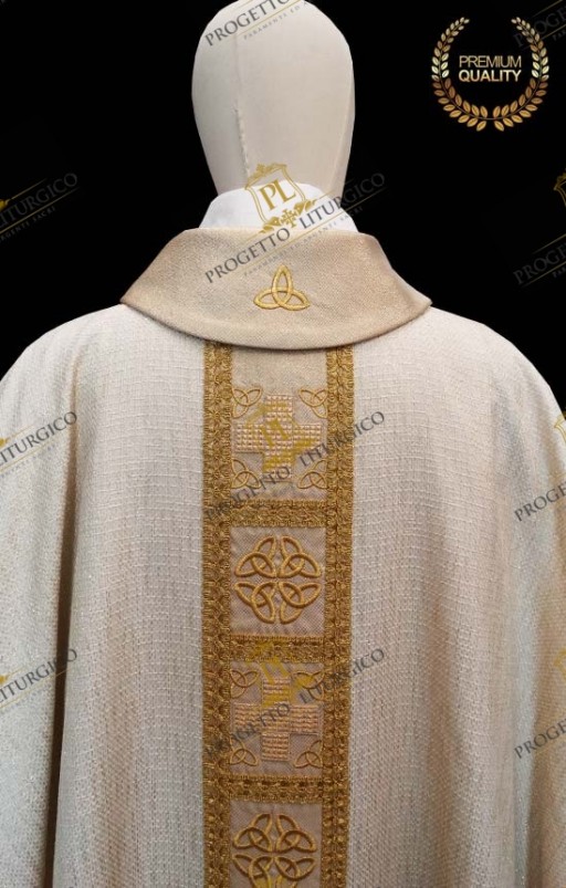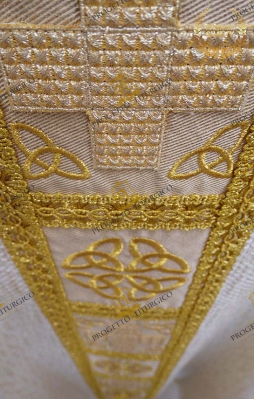 This white chasuble is made with a particular wool fabric, whose weave, inside, contains golden metallic threads that give the vestment a discreet brightness.