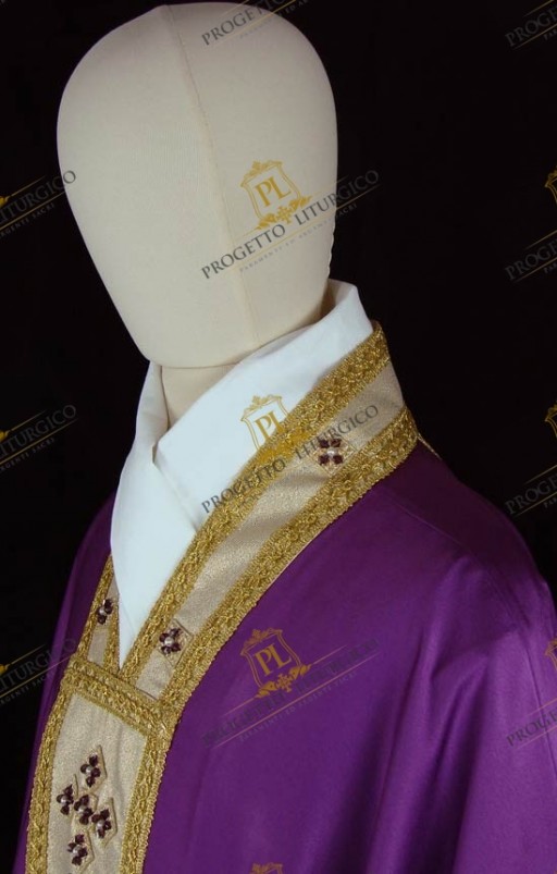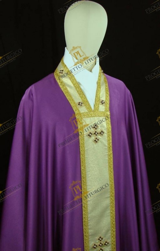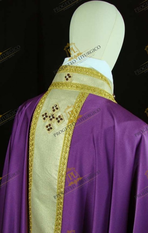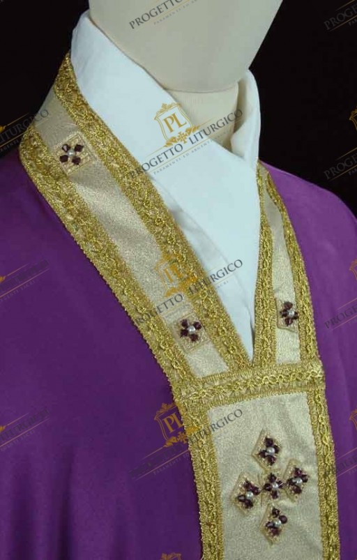 Essa è realizzata in morbido e leggero tessuto cady di misto seta nel colore morello. Il collo montante e gli stoloni sono, invece, realizzati in lana papale dorata, percorsi da delicati agremani traforati dorati. Il contrasto cromatico che così si genera è molto bello e dona luce a questa preziosa casula gotica morello.