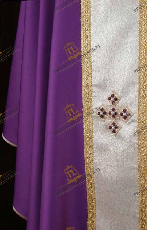 Gli stoloni di questa casula gotica morello sono decorati sia sul davanti che sul dietro con croci ricamate impreziosite da perle e cristalli color ametista cuciti a mano. Le stesse croci sono presenti sulla stola sacerdotale coordinata alla casula gotica morello, completa anche di fiocchi.