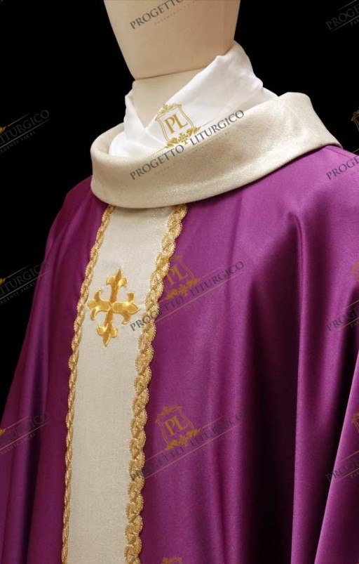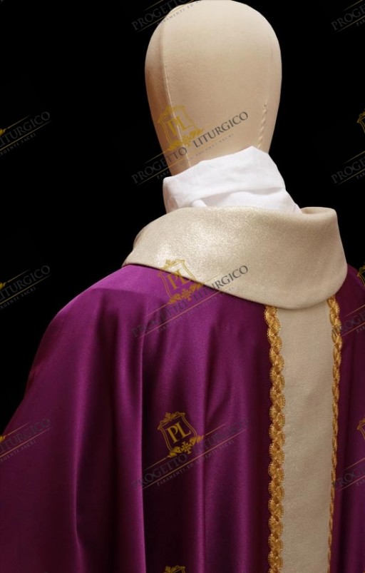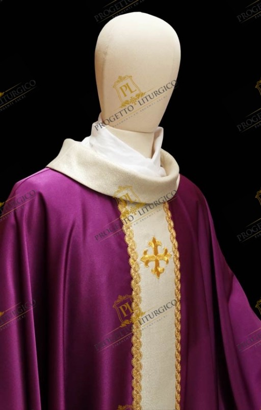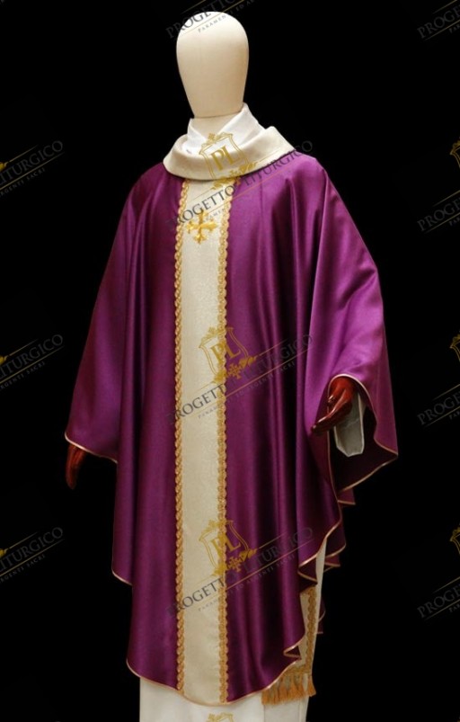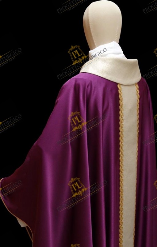 E' molto semplice ma nello stesso tempo dignitosa questa casula morello, realizzata in morbido cady di misto seta di un viola scarico, adatta al tempo di Avvento.