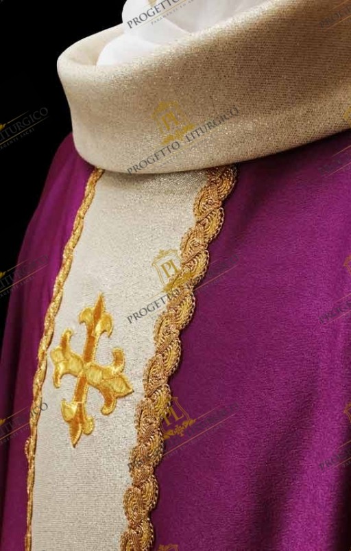 Il collo tondo e gli stoloni della casula morello, sono realizzati in lana papale, delicatamente dorata. Solo sul davanti, una graziosa croce è ricamata con filato dorato e dona luce a tutto il capo.