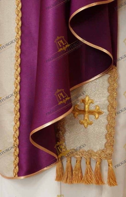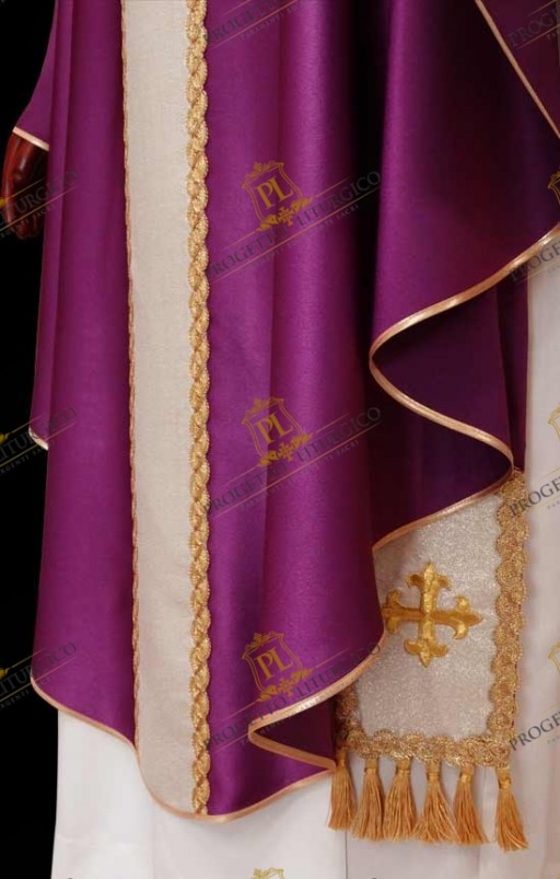 La stessa croce ricamata è presente sulle estremità della stola sacerdotale coordinata alla casula morello, realizzata nello stesso cady della casula e foderata con tessuto di raso dorato. La stola è, infine, completa di fiocchi.