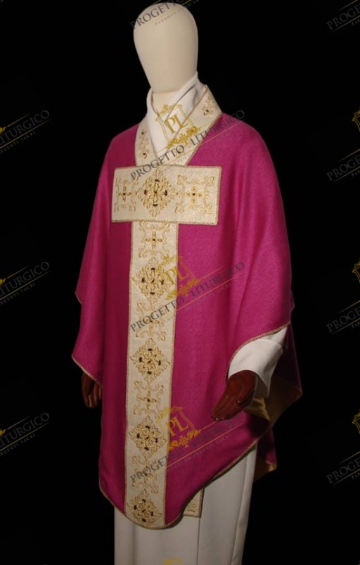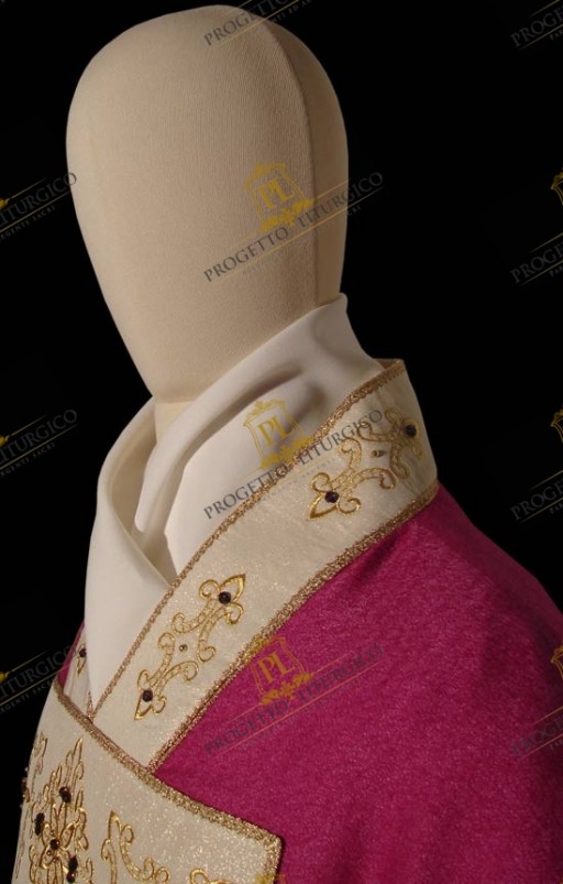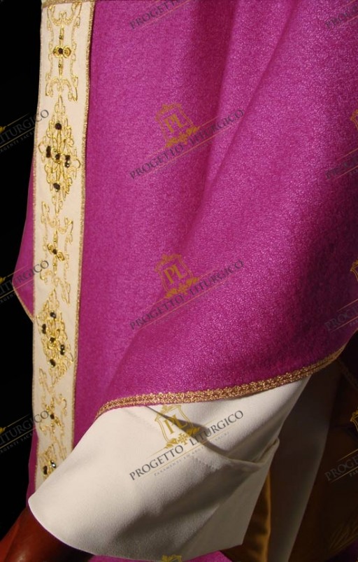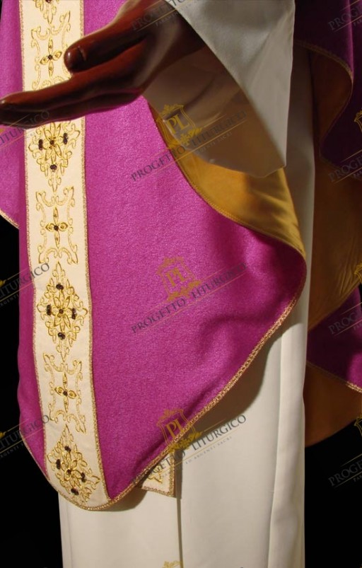 Tutta la casula morello è foderata con tessuto di raso dorato che ben si raccorda ai toni dorati della decorazione e dell'agremano che rifinisce tutto il profilo della casula