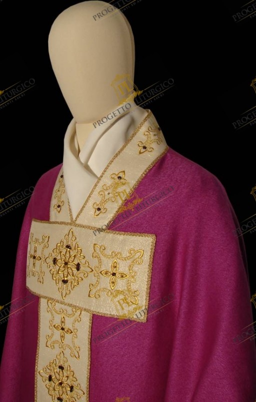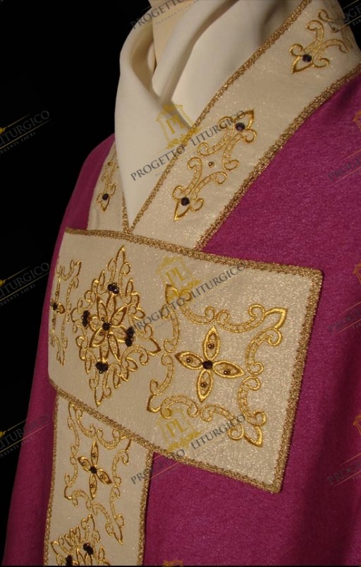 La decorazione della casula morello è costituita dal tau sul davanti e dallo stolone sul ditro, entrambi finemente ricamati con filato dorato e imprenziositi con cristalli color tanzanite e perline dorate.