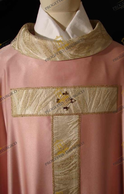 For the third Sunday of Advent, Gaudete Sunday; and on the fourth Sunday of Lent, Laetare Sunday, we offer a rose chasuble made of soft and light cady fabric with tau on the front.