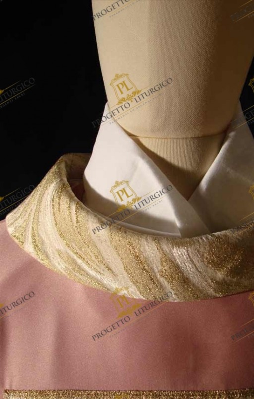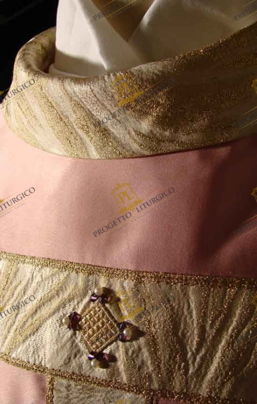 The round neck and all the decoration of the rose chasuble are made of a precious brocade fabric. The tau is placed on the front, defined by a delicate golden trimming and discreetly decorated with a cross created with an embroidered application embellished with amethyst-colored pearls and crystals. On the back of the rose chasuble there is, instead, the stolon.