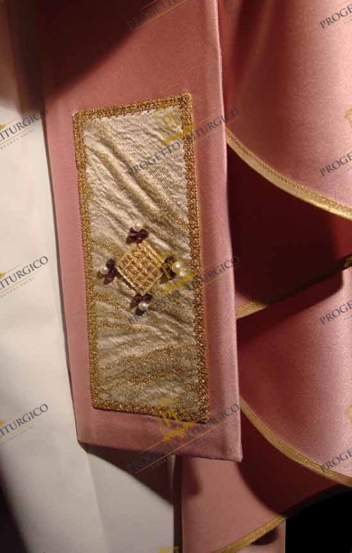 The same decoration of the rose chasuble is present on the ends of the matching priestly stole, made in the same pink cady as the chasuble.