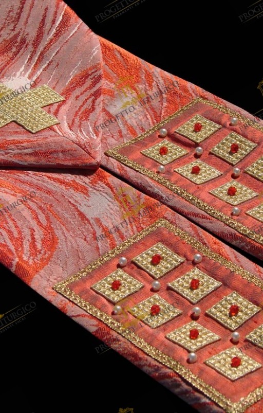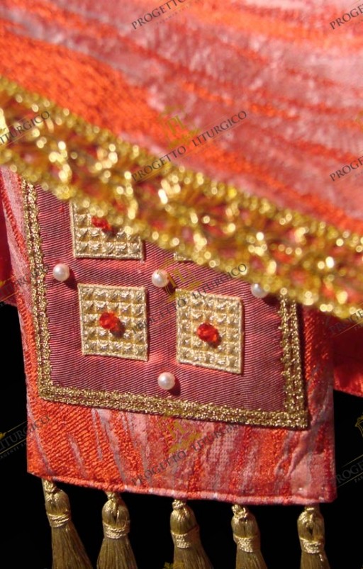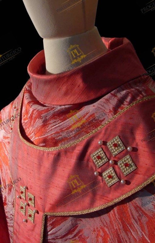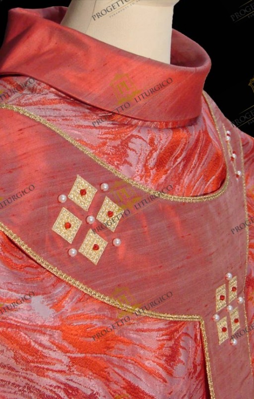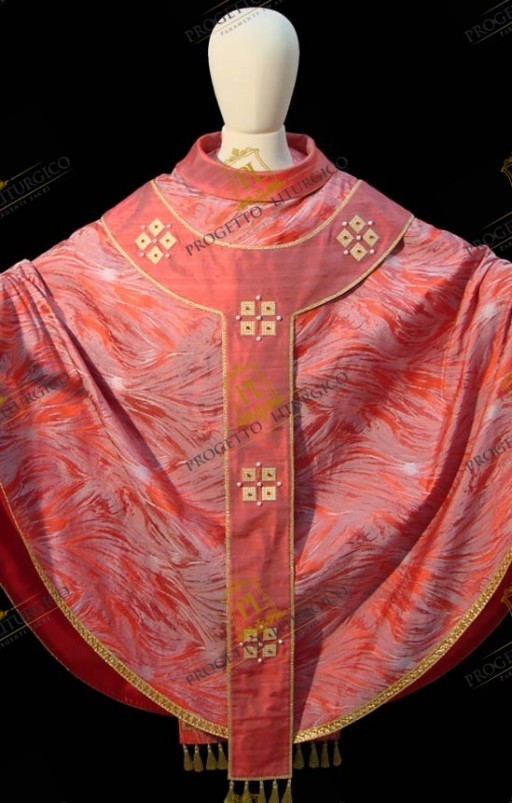 The early Christian red chasuble is made of a particular brocade fabric with a flame design on which the pallium rests, which is instead made of red shantung silk.