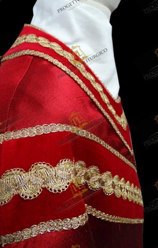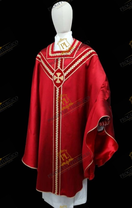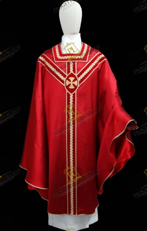 The early Christian red chasuble is made of precious red shantung silk fabric. The shape is the early Christian one, with the typical "bell" shape. The neckline is square and is made of red velvet, as is the entire decoration made up of a central stole towards which two arms join, in the typical cross called St Andrew's.