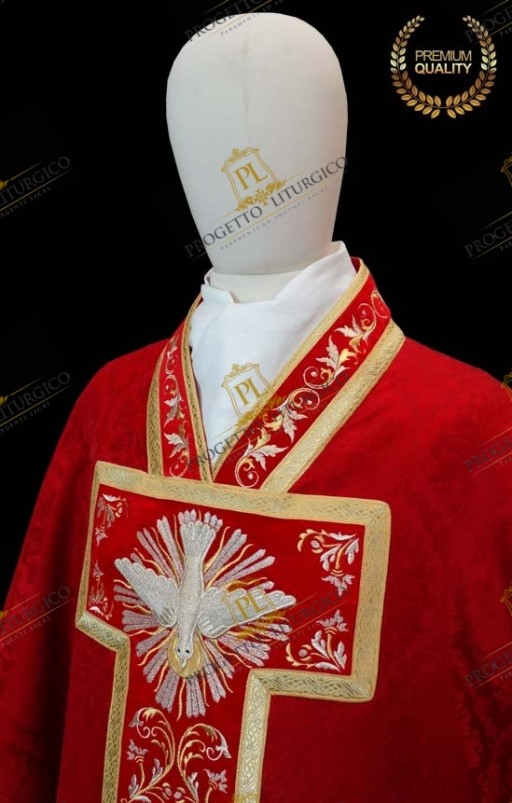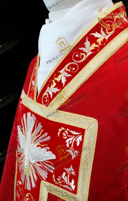 The embroidery of the red Borromean chasuble is also inspired by baroque floral motifs, and is made with metallic thread in two different shades of gold. The main decorative element is the dove of the Spirit embroidered and placed in the center of the chest of the red Borromean chasuble, with a particular manufacturing technique that makes the embroidery almost three-dimensional.