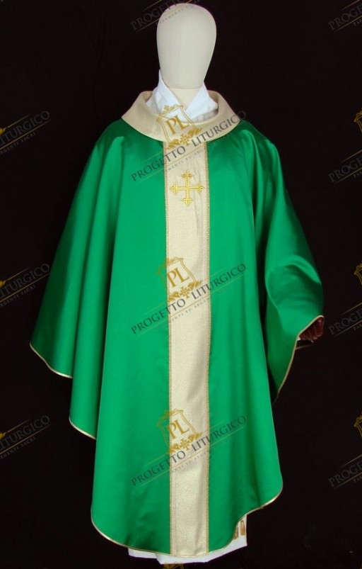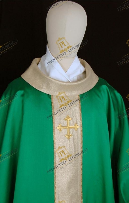 Nella sua semplicità questa casula verde risulta molto elegante e preziosa grazie alla pregevolezza del tessuto con cui è realizzata, un mikado di seta di un bel verde brillante. Per creare un contrasto cromatico raffinato, il collo tondo e le fasce di decorazione del davanti e del dietro sono realizzate in lana papale dorata, che, grazie alla laminatura del tessuto, contribuisce a dare luminosità alla casula verde.