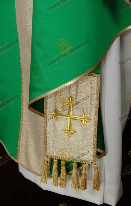 La stola sacerdotale coordinata alla casula verde in seta presenta la medesima decorazione della casula: sulle estremità due croci ricamate sulla lana papale impreziosiscono la stola e, nell'insieme, l'intera casula verde.