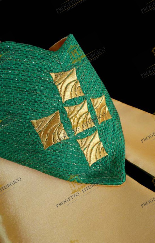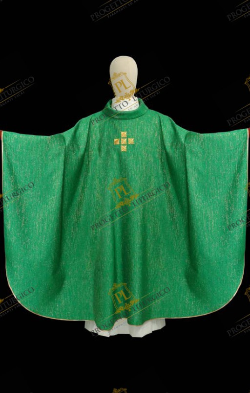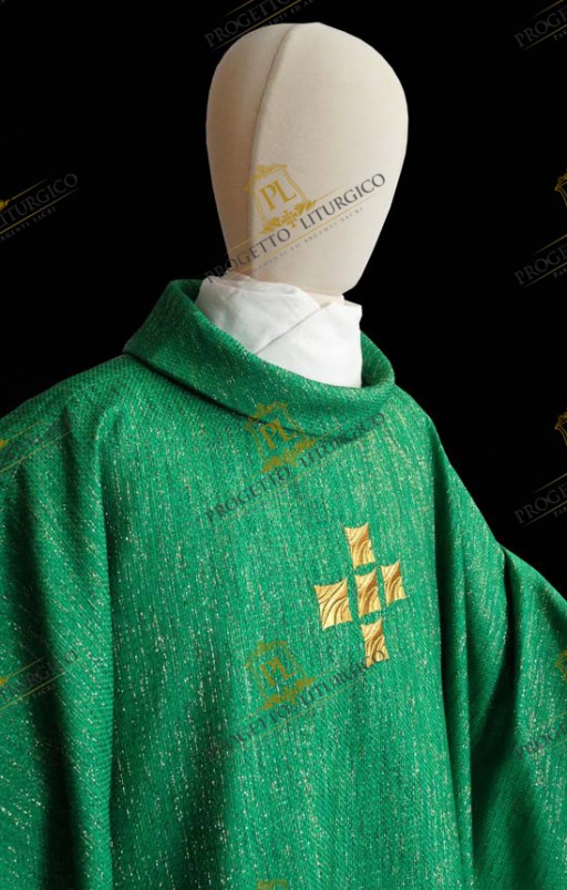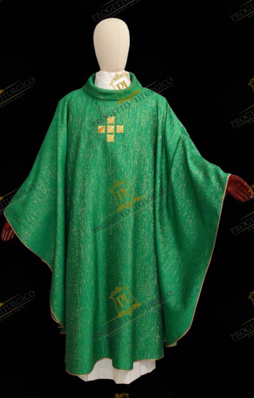 Il collo tondo, ampio e ben sostenuto, è realizzato in lana papale dorata. Della stessa lana sono realizzati gli stoloni che impreziosiscono il davanti e il dietro della casula verde, bordati con un delicato agremano traforato. All'altezza del petto, è presente una semplice e raffinata croce, ricamata con filato dorato.