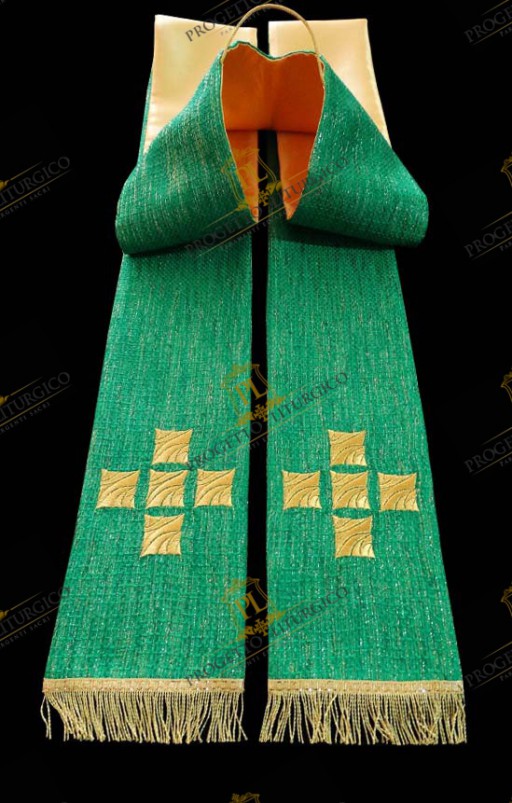 La stessa croce ricamata sulla casula decora i due lembi della stola sacerdotale abbinata alla casula verde. Essa è realizzata nello stesso cady verde della casula, foderata con un bel tessuto di raso dorato, ed è completa di fiocchi in oro mezzo fino, cuciti a mano.