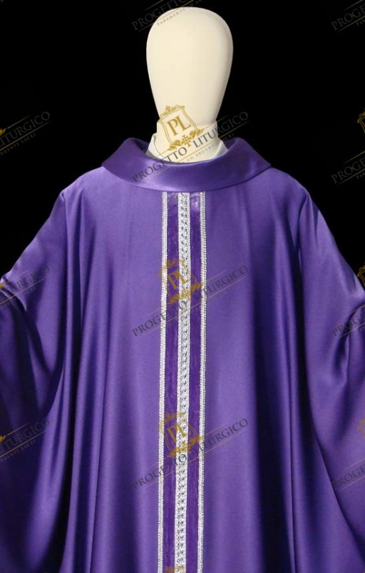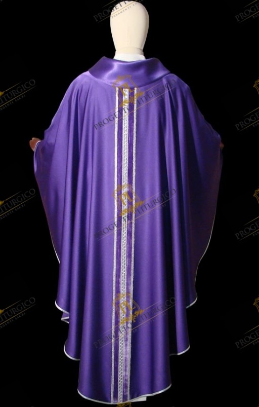 This purple chasuble is light, dignified and elegant. it is made of a very light silk blend cady in a beautiful Lenten purple, with a round neck and stolons.