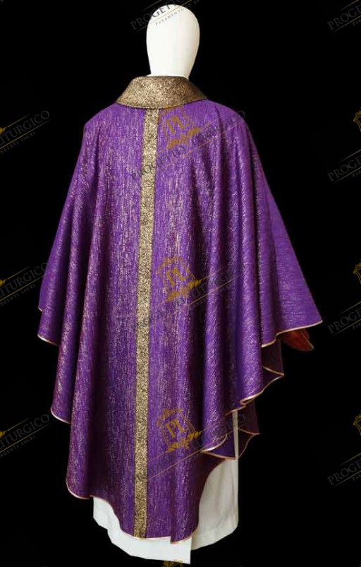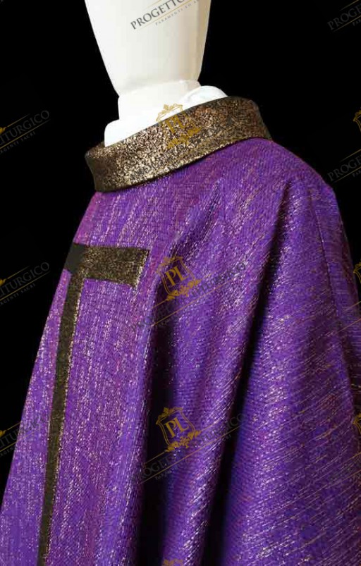 The purple chasuble has a round neck, made with a particular golden fabric on a black background. The same fabric is used to make the tau that adorns the front of the chasuble, and the stolon that decorates the back.