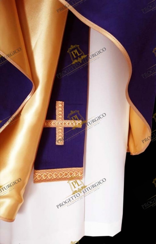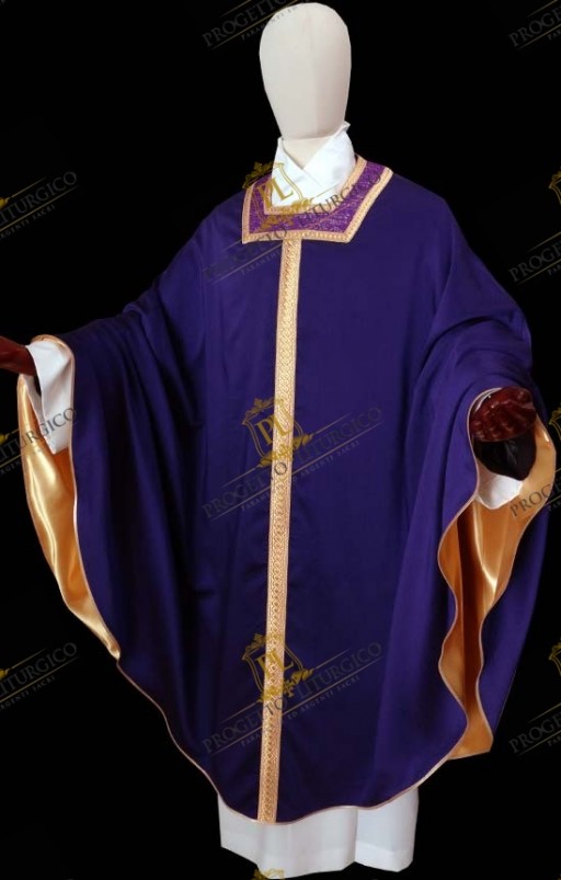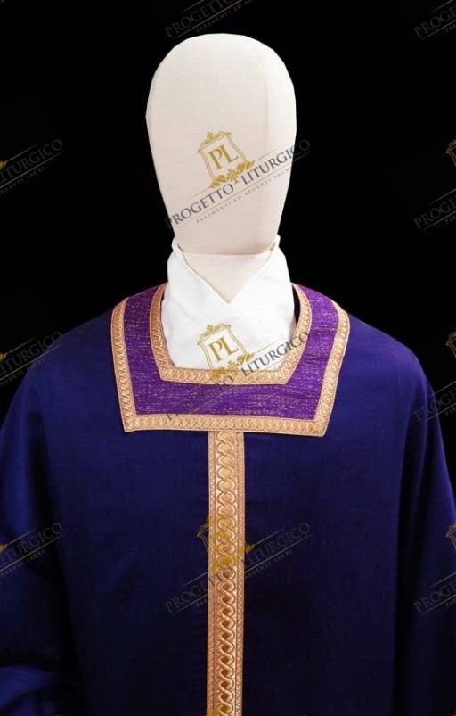 The early Christian shape is characterized by a "bell" shape and a square neckline. A purple woolen fabric with gold metallic thread has been used to embellish the neck, edged with a pretty gold agreman.