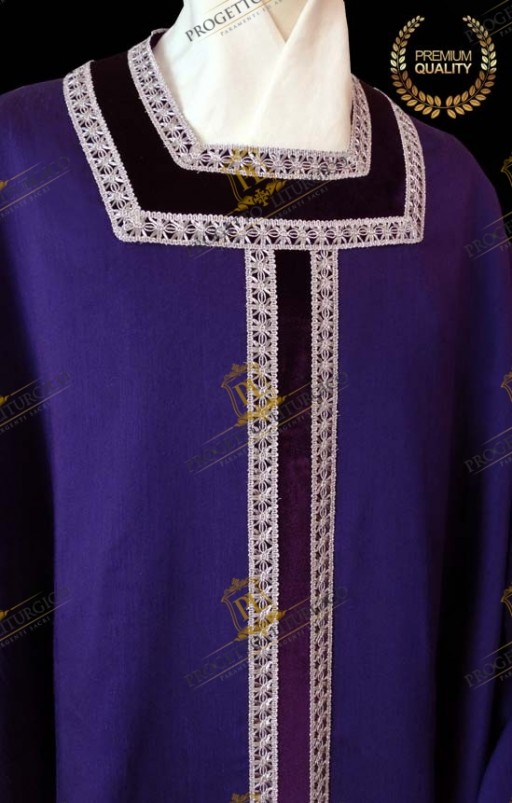 The square neckline of the early Christian purple chasuble is made of purple velvet fabric, enlivened by a very elegant openwork silver trimming. The same decorative motif is repeated in the realization of the front and back stolons: purple velvet bands are finely embellished with the same silver agreman, with a very luminous final effect.