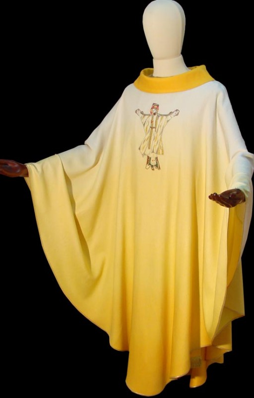 La casula dorata è realizzata secondo il modello ampio contemporaneo, in un morbidissimo tessuto di seta shantung e lana dal tono dorato degradato. Il collo è tondo e molto comodo, perchè rimane sostenuto e non si schiaccia come si vede in certi paramenti.