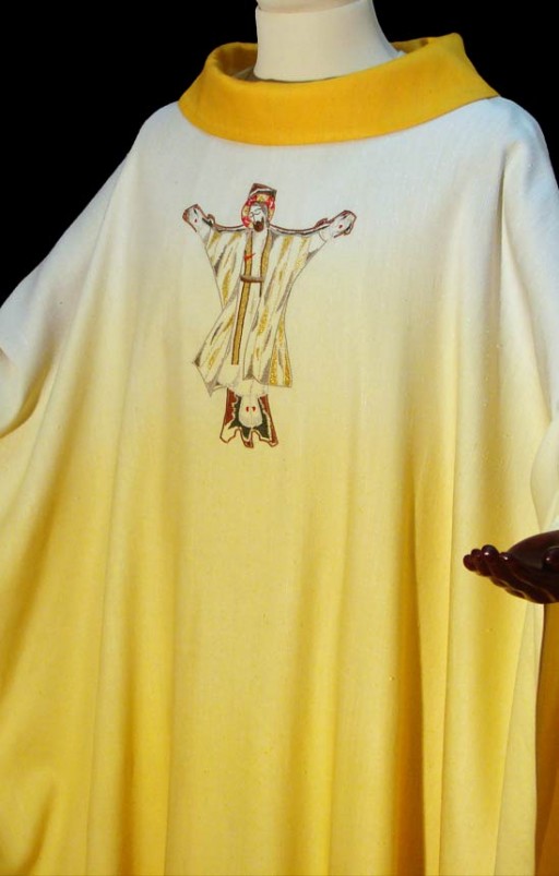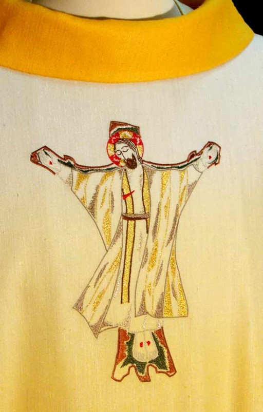Ciò che rende unica questa casula dorata è il ricamo personalizzato realizzato all'altezza del petto. Esso è una precisa richiesta del cliente che ha voluto riportare sul paramento liturgico l'immagine di Cristo, parte di un importante mosaico presente nella chiesa.