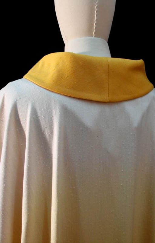 Tutt'intorno al profilo della casula, corre uno sbieco in seta dorato che rifinisce tutte le cuciture della casula dorata.