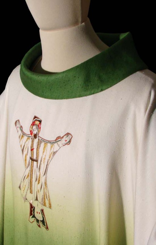A volere tale personalizzazione è stato il cliente che ci ha commissionato la casula verde: voleva sul paramento liturgico un riferimento al grandioso mosaico che impreziosisce la chiesa dove egli opera.