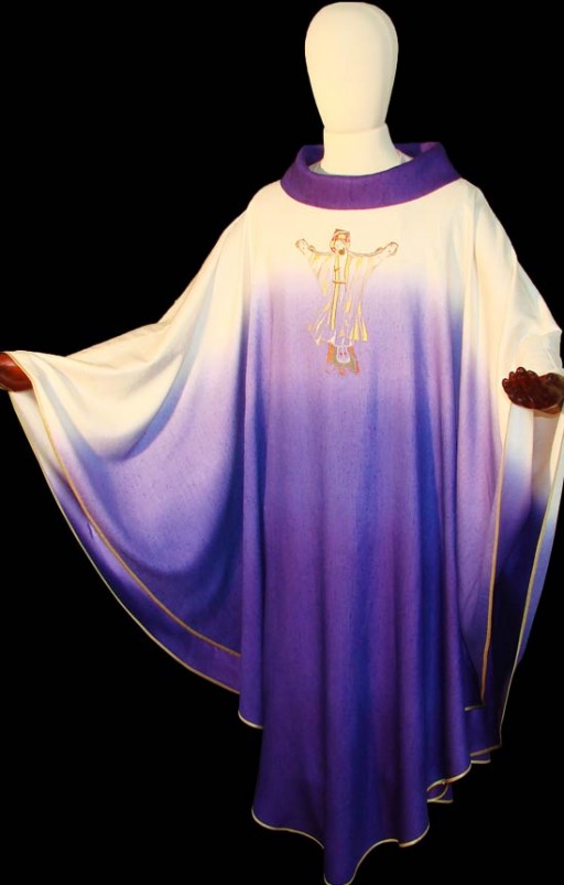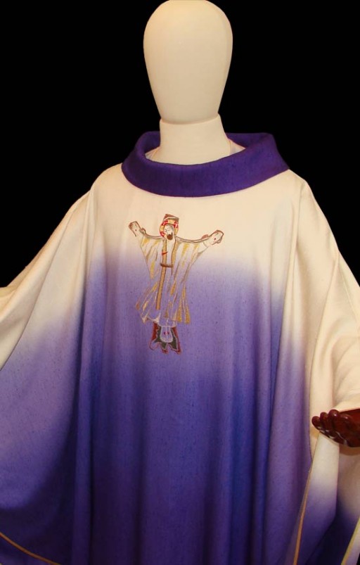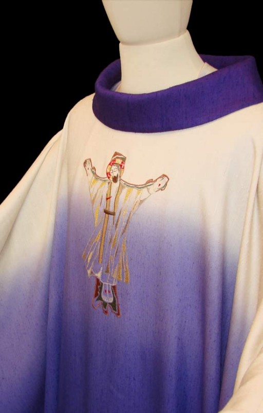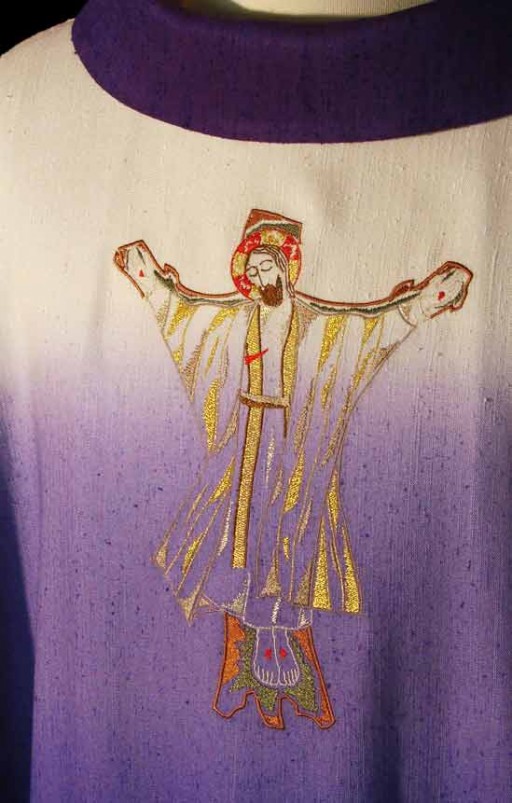 La casula viola con il Cristo ricamato fa parte di una serie di paramenti realizzati su esclusiva richiesta di un nostro committente. Il disegno del Cristo è tratto da un mosaico di un noto autore presente all'interno della chiesa presso cui opera il committente, e che rappresenta un po' il simbolo dell'intera parrocchia.