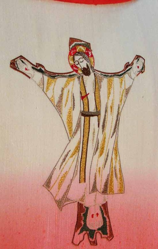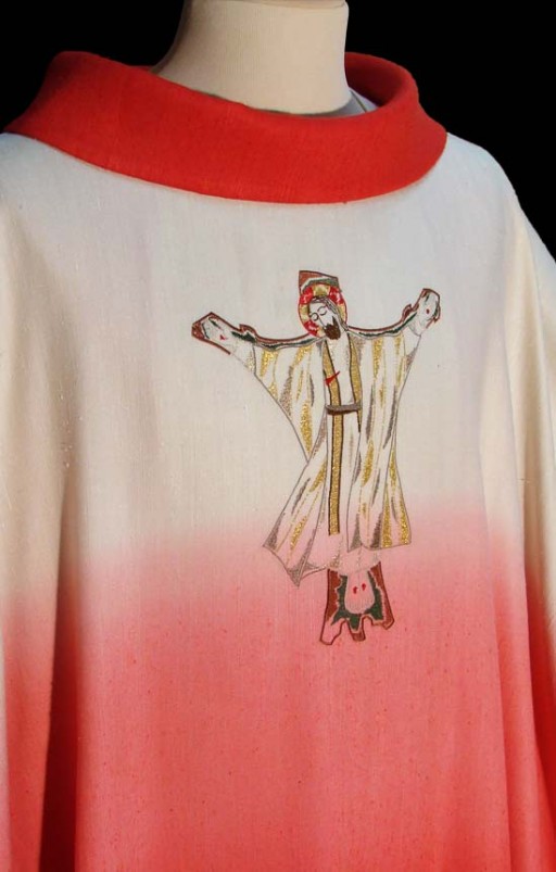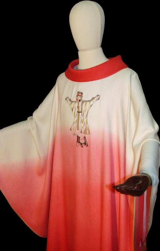Sul petto della casula rossa è ricamato, in filato di vario colore, un Cristo tratto da un mosaico di un autore famoso. La casula rossa è, infatti, il frutto di una precisa richiesta del sacerdote che l'ha commissionata.