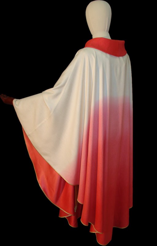 La casula rossa che qui vediamo è realizzata in un morbido tessuto di lana e seta shantung ed è confezionata secondo la foggia più diffusa nei nostri tempi, ovvero con il collo tondo e molto ampia.